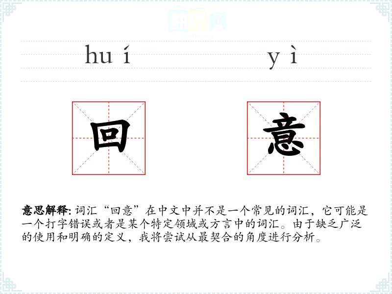 由于“回意”不是一个标准词汇,我们无法给出确切的字面意思和基本含义。如果我们将“回意”拆分为“回”和“意”,“回”通常表示返回或回应,“意”表示意思或意图。结合起来,可能是指“返回的意思”或“回应的意图”。