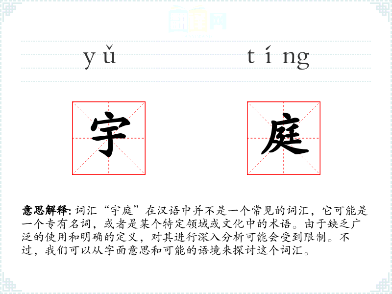 由于“宇庭”不是一个常用词汇,它在不同语境下的使用可能非常有限。如果它是一个专有名词,那么它可能出现在某个特定的文学作品、历史记载或地理名称中。