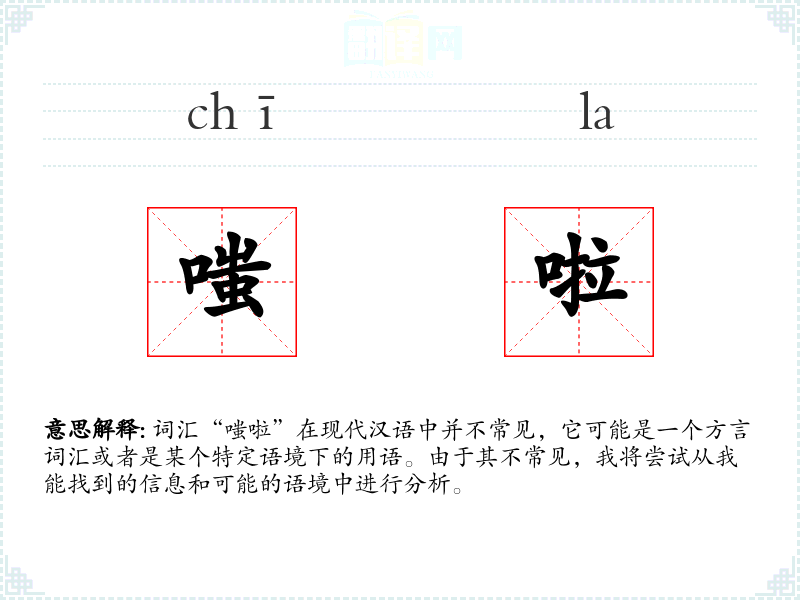 词汇“嗤啦”在现代汉语中并不常见,它可能是一个方言词汇或者是某个特定语境下的用语。由于其不常见,我将尝试从我能找到的信息和可能的语境中进行分析。