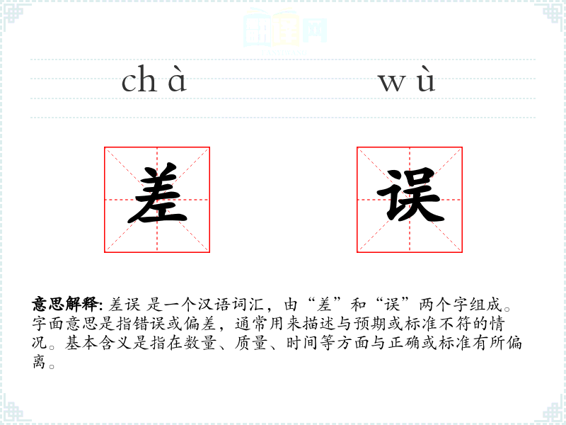 差误 是一个汉语词汇,由“差”和“误”两个字组成。字面意思是指错误或偏差,通常用来描述与预期或标准不符的情况。基本含义是指在数量、质量、时间等方面与正确或标准有所偏离。