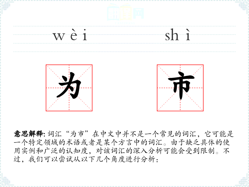 由于“为市”不是一个标准的中文词汇,我们无法给出一个确切的基本定义。它可能是指“为了市场”或“在市场上”的意思,但这只是基于字面组合的猜测。