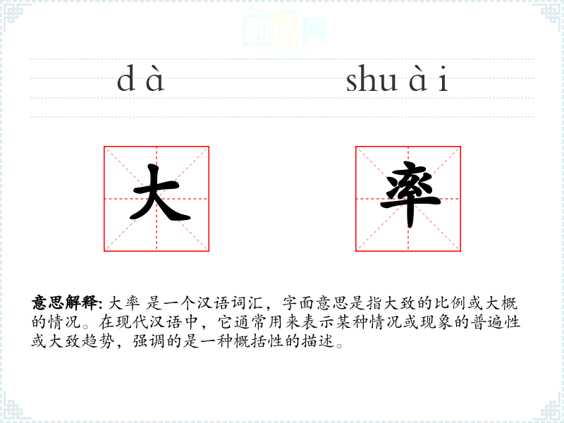 大率 是一个汉语词汇,字面意思是指大致的比例或大概的情况。在现代汉语中,它通常用来表示某种情况或现象的普遍性或大致趋势,强调的是一种概括性的描述。
