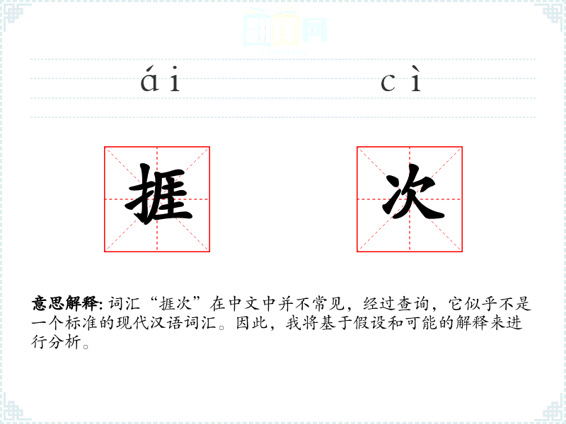 词汇“捱次”在中文中并不常见,经过查询,它似乎不是一个标准的现代汉语词汇。因此,我将基于假设和可能的解释来进行分析。