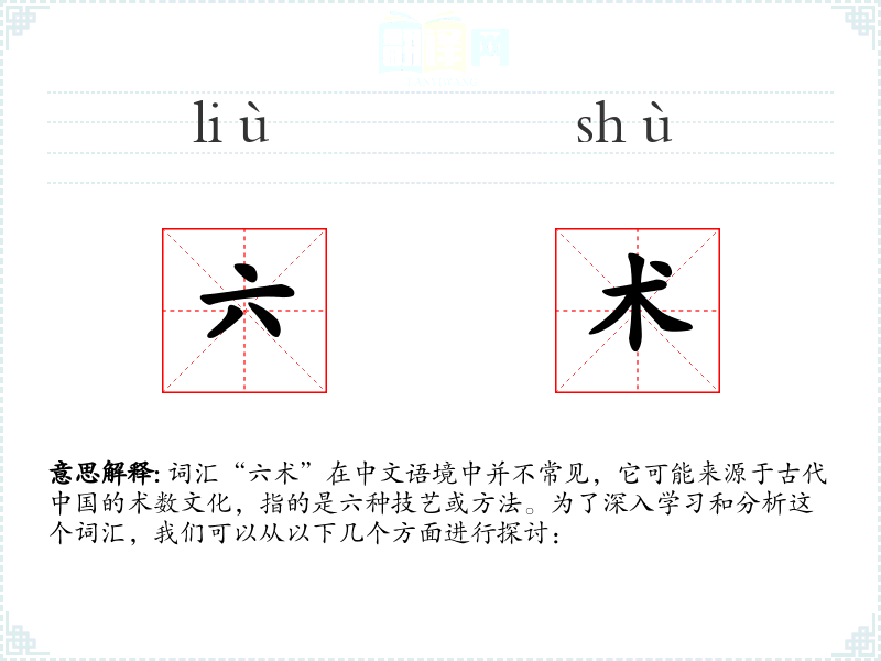 - 反义词:无(由于“六术”不是一个常用词汇,反义词不明显)