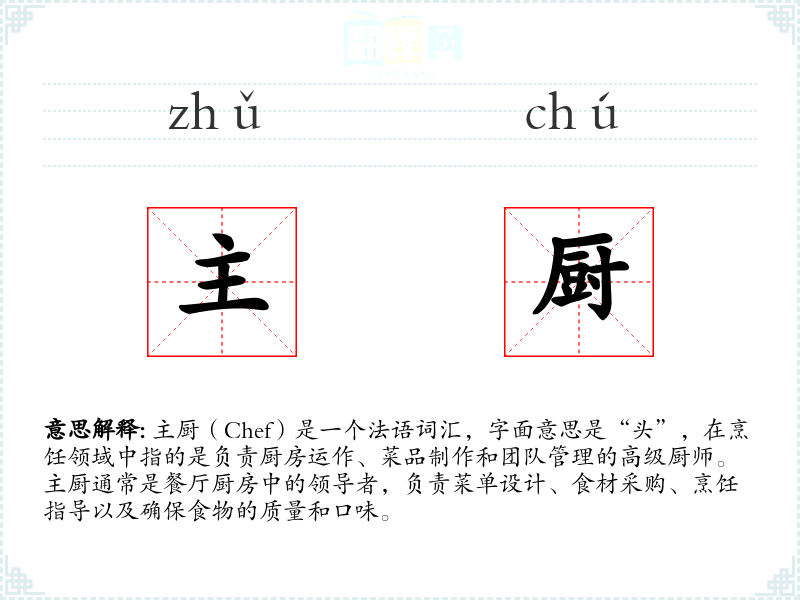- 反义词:学徒、厨房助手。这些词汇指的是在厨房中处于学习和辅助地位的人员。