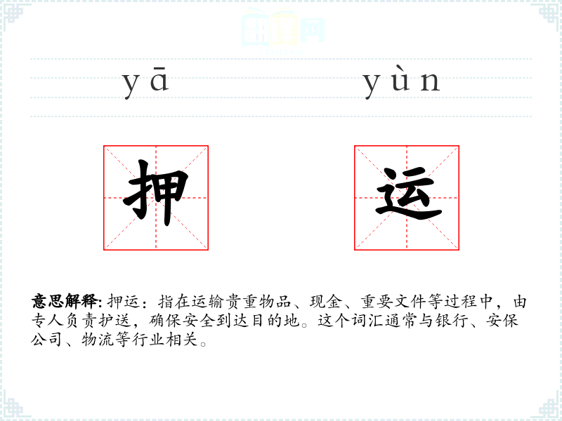 押运:指在运输贵重物品、现金、重要文件等过程中,由专人负责护送,确保安全到达目的地。这个词汇通常与银行、安保公司、物流等行业相关。
