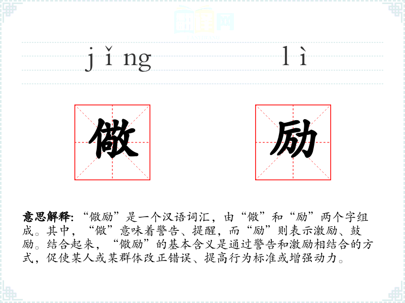 “儆励”是一个汉语词汇,由“儆”和“励”两个字组成。其中,“儆”意味着警告、提醒,而“励”则表示激励、鼓励。结合起来,“儆励”的基本含义是通过警告和激励相结合的方式,促使某人或某群体改正错误、提高行为标准或增强动力。