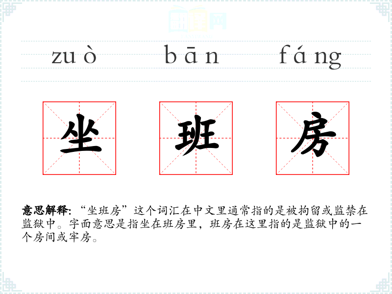 “坐班房”这个词汇在中文里通常指的是被拘留或监禁在监狱中。字面意思是指坐在班房里,班房在这里指的是监狱中的一个房间或牢房。