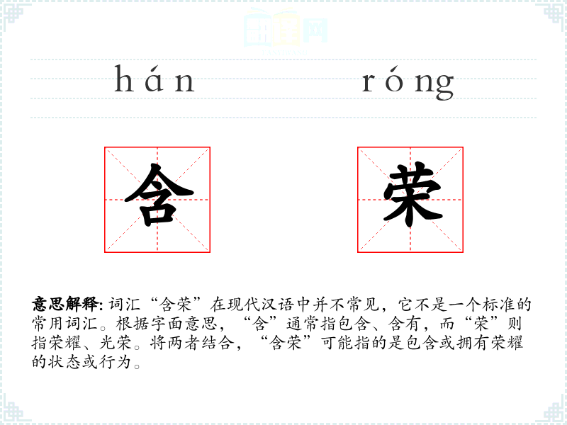 尽管“含荣”不是一个常用词汇,但它提供了一种表达内在荣耀感的方式。在语言学*和表达中,了解和掌握这样的词汇可以帮助我们更丰富地表达情感和思想。
