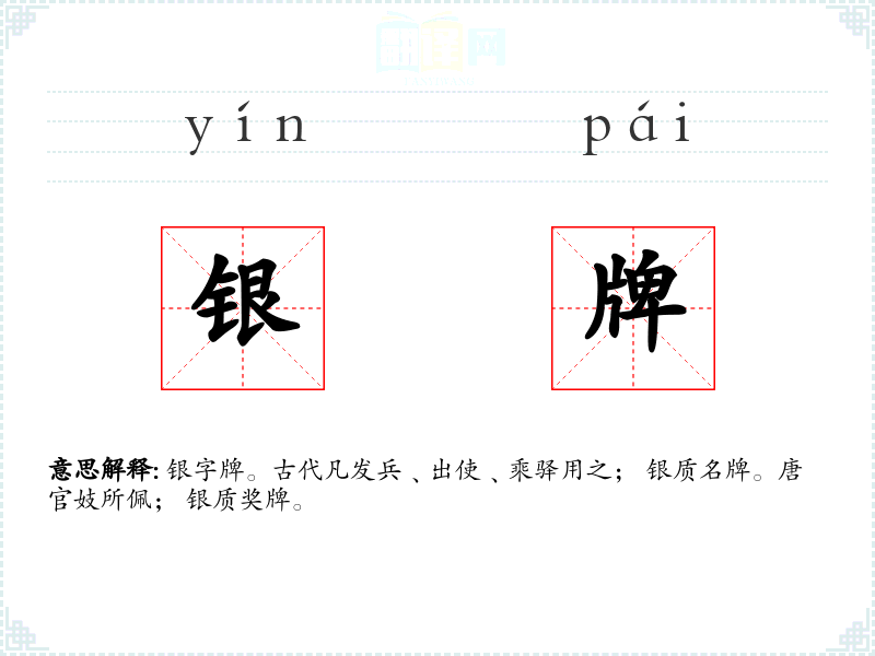 银字牌。古代凡发兵﹑出使﹑乘驿用之; 银质名牌。唐官妓所佩; 银质奖牌。