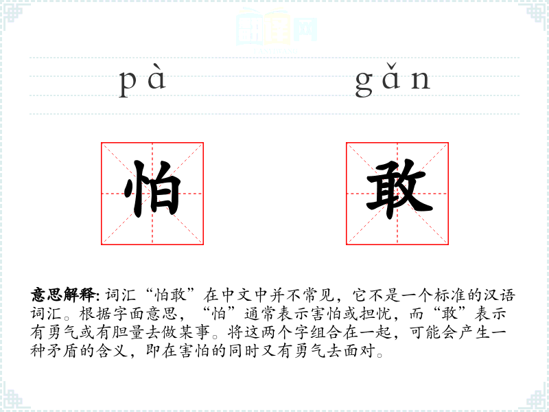 词汇“怕敢”在中文中并不常见,它不是一个标准的汉语词汇。根据字面意思,“怕”通常表示害怕或担忧,而“敢”表示有勇气或有胆量去做某事。将这两个字组合在一起,可能会产生一种矛盾的含义,即在害怕的同时又有勇气去面对。