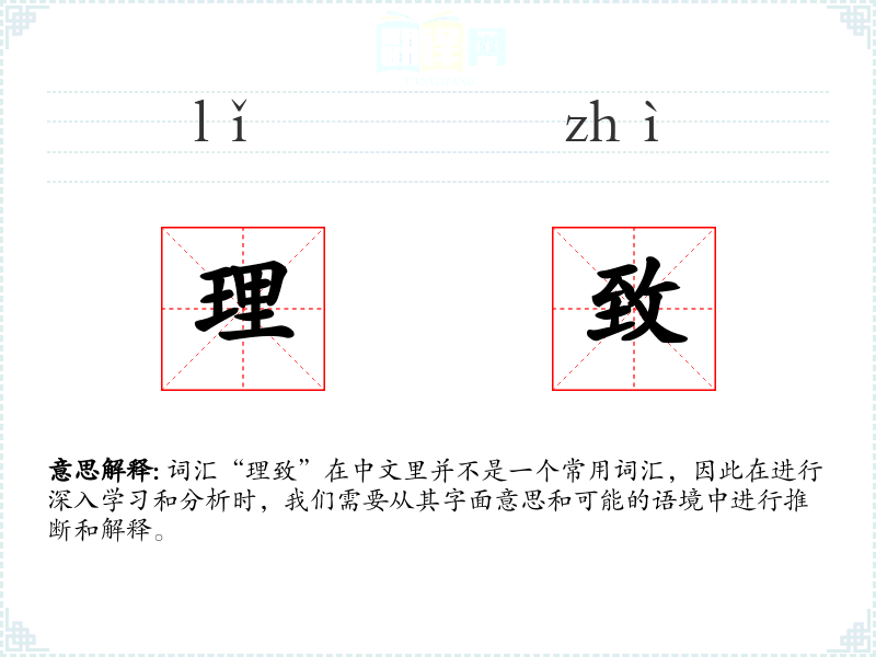 词汇“理致”在中文里并不是一个常用词汇,因此在进行深入学习和分析时,我们需要从其字面意思和可能的语境中进行推断和解释。