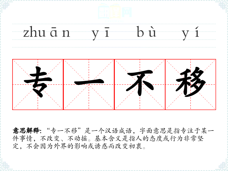 “专一不移”是一个汉语成语,字面意思是指专注于某一件事情,不改变、不动摇。基本含义是指人的态度或行为非常坚定,不会因为外界的影响或诱惑而改变初衷。