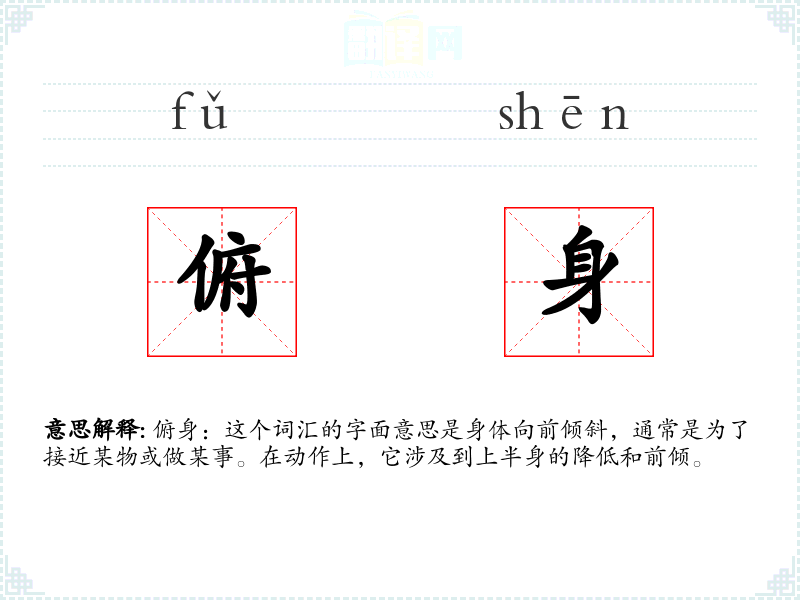 俯身:这个词汇的字面意思是身体向前倾斜,通常是为了接近某物或做某事。在动作上,它涉及到上半身的降低和前倾。