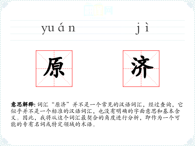 由于“原济”不是一个标准的汉语词汇,我们无法给出一个确切的基本定义。它可能是某个特定领域或专有名词的缩写或简称,但没有足够的信息来确定其确切含义。
