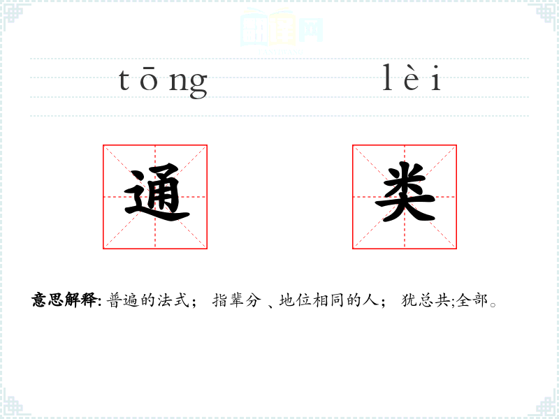 普遍的法式; 指辈分﹑地位相同的人; 犹总共;全部。