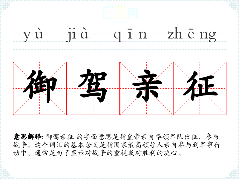 御驾亲征 的字面意思是指**亲自率领军队出征,参与战争。这个词汇的基本含义是指国家最高领导人亲自参与到军事行动中,通常是为了显示对战争的重视或对胜利的决心。