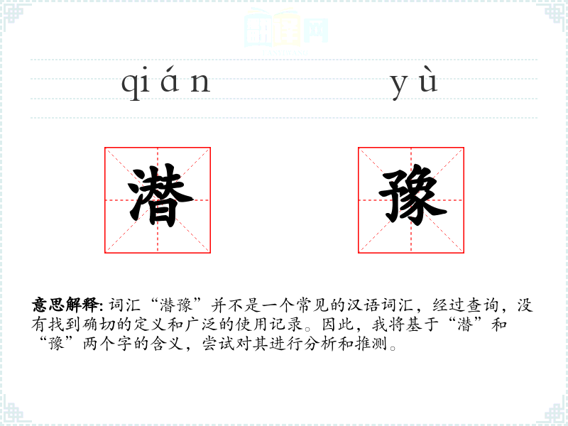 词汇“潜豫”并不是一个常见的汉语词汇,经过查询,没有找到确切的定义和广泛的使用记录。因此,我将基于“潜”和“豫”两个字的含义,尝试对其进行分析和推测。