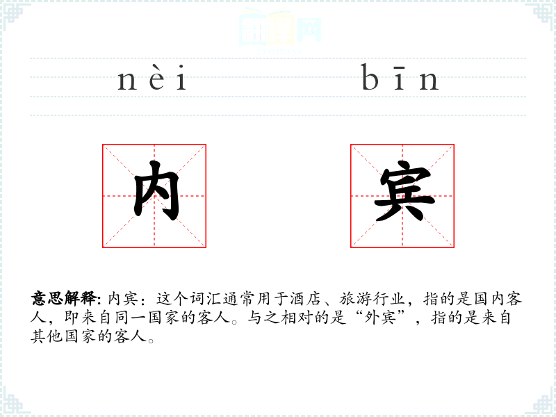 内宾:这个词汇通常用于酒店、旅游行业,指的是国内客人,即来自同一国家的客人。与之相对的是“外宾”,指的是来自其他国家的客人。