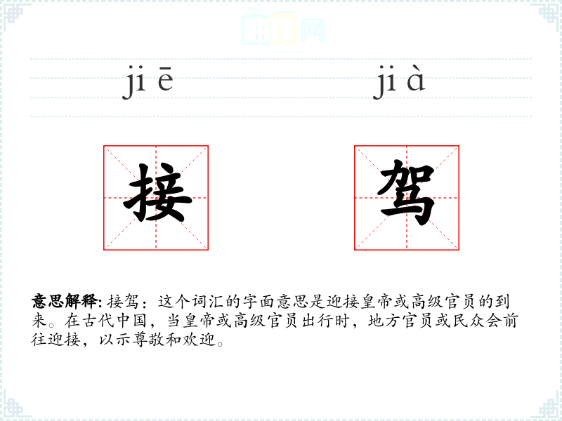 理解:接驾是一个富有历史和文化内涵的词汇,它不仅体现了古代的礼仪制度,也反映了人们对重要人物的尊重和欢迎。 重要性:在语言学*和表达中,了解接驾这样的词汇有助于更好地理解文化背景和历史传统,丰富语言表达的深度和广度。