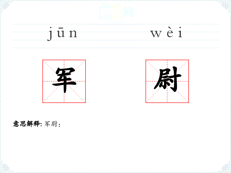 - 字面意思:军尉是由“军”和“尉”两个字组成,其中“军”指军队,“尉”在古代指军官的一种职位。