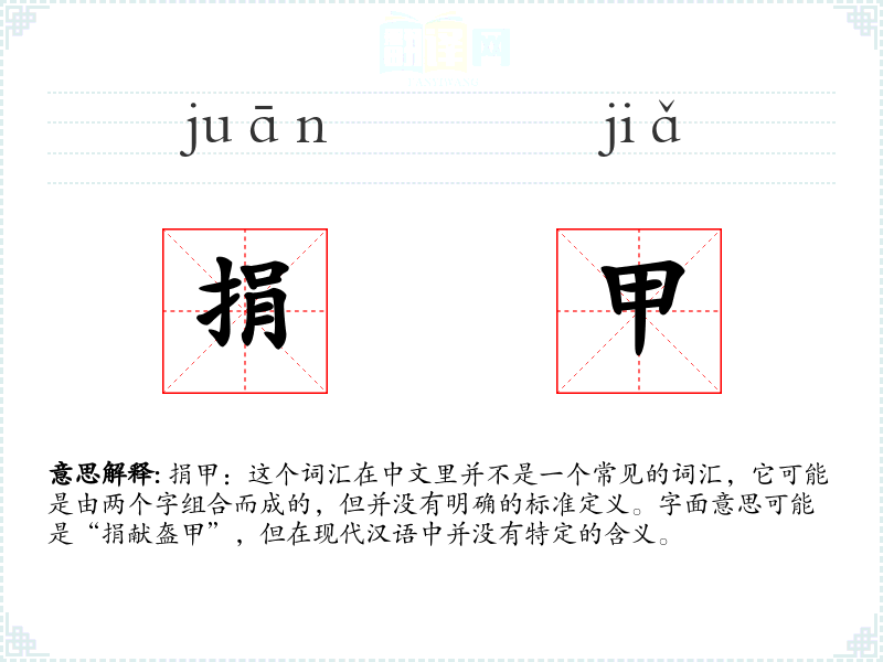 捐甲:这个词汇在中文里并不是一个常见的词汇,它可能是由两个字组合而成的,但并没有明确的标准定义。字面意思可能是“捐献盔甲”,但在现代汉语中并没有特定的含义。