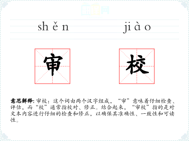 审校:这个词由两个汉字组成,“审”意味着仔细检查、评估,而“校”通常指校对、修正。结合起来,“审校”指的是对文本内容进行仔细的检查和修正,以确保其准确性、一致性和可读性。