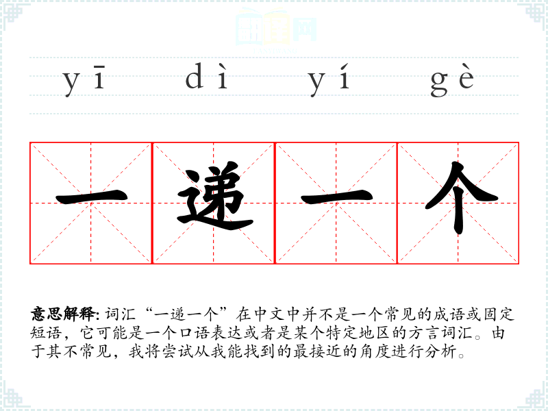 词汇“一递一个”在中文中并不是一个常见的成语或固定短语,它可能是一个口语表达或者是某个特定地区的方言词汇。由于其不常见,我将尝试从我能找到的最接近的角度进行分析。