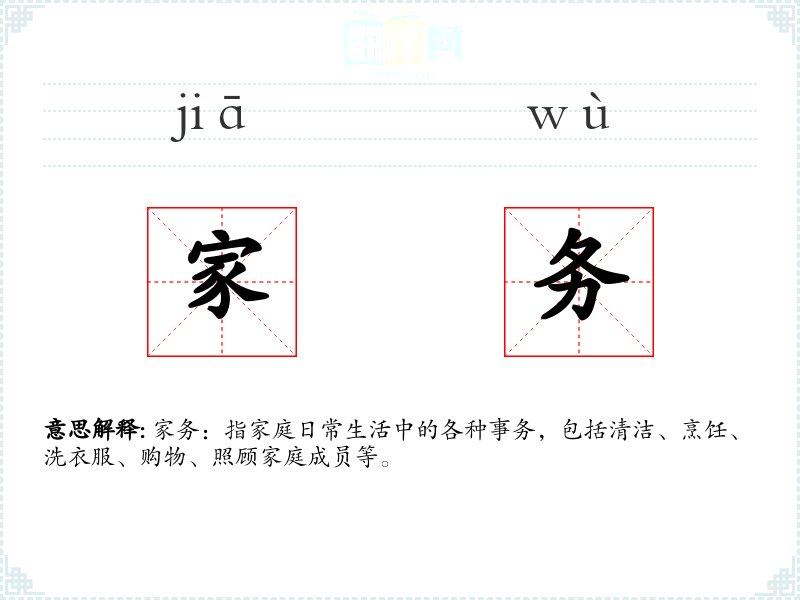- 词源:“家务”一词由“家”和“务”组成,“家”指家庭,“务”指事务或工作。