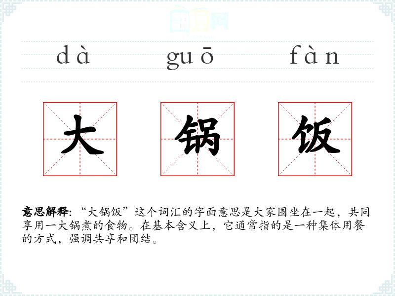 “大锅饭”这个词汇的字面意思是大家围坐在一起,共同享用一大锅煮的食物。在基本含义上,它通常指的是一种集体用餐的方式,强调共享和团结。