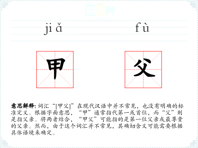 在文学作品中,“甲父”可能被用来形容一个家族中地位最高的父亲,或者在某种排名或等级制度中的首位父亲。在口语中,这个词汇可能不太常用,除非在特定的社群或文化背景下。在专业领域,如历史学或社会学,可能会用这个词汇来描述特定的社会结构或家族关系。