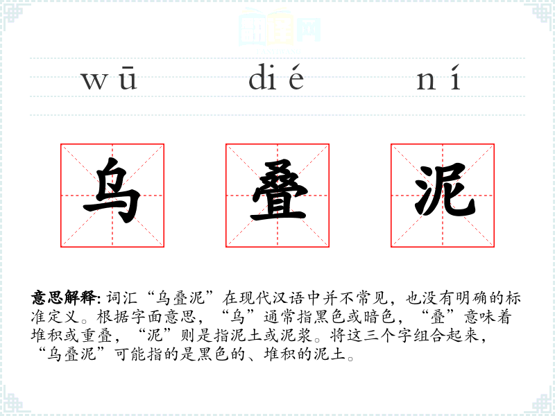 词汇“乌叠泥”在现代汉语中并不常见,也没有明确的标准定义。根据字面意思,“乌”通常指黑色或暗色,“叠”意味着堆积或重叠,“泥”则是指泥土或泥浆。将这三个字组合起来,“乌叠泥”可能指的是黑色的、堆积的泥土。