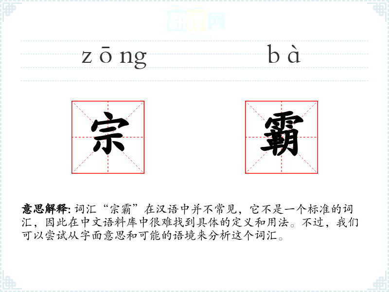 词汇“宗霸”在汉语中并不常见,它不是一个标准的词汇,因此在中文语料库中很难找到具体的定义和用法。不过,我们可以尝试从字面意思和可能的语境来分析这个词汇。