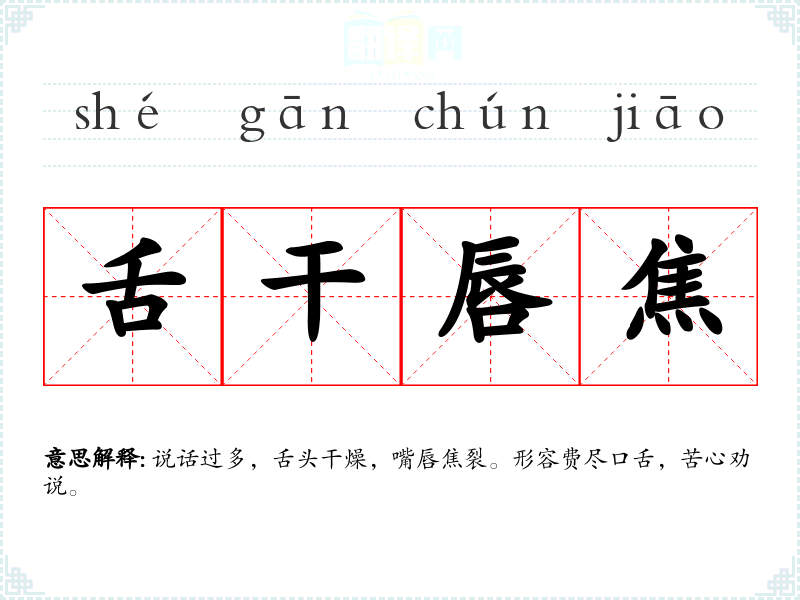 说话过多,舌头干燥,嘴唇焦裂。形容费尽口舌,苦心劝说。