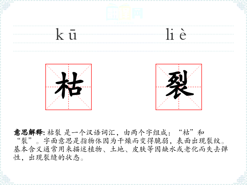 “枯”字古汉语中指植物失去水分而干瘪,“裂”字则指物体因外力或内力作用而分开。两个字组合起来,形成了描述物体因干燥而出现裂纹的状态。