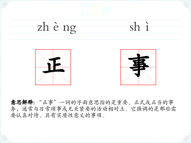 - 专业领域:在商业或法律等领域,“正事”通常指正式的业务或法律事务。