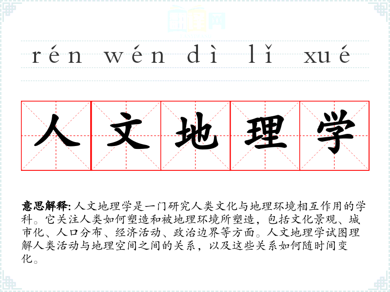 同义词:文化地理学、社会地理学。这些词汇都强调了人类文化与地理环境的关系,但“文化地理学”更侧重于文化现象,“社会地理学”则侧重于社会结构和过程。