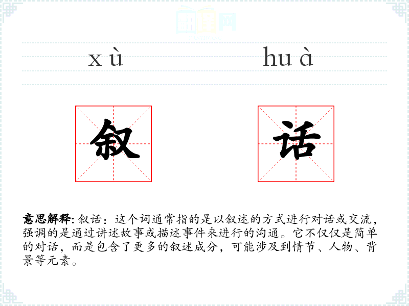 叙话:这个词通常指的是以叙述的方式进行对话或交流,强调的是通过讲述故事或描述**来进行的沟通。它不仅仅是简单的对话,而是包含了更多的叙述成分,可能涉及到情节、人物、背景等元素。