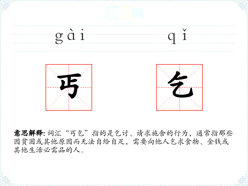 词汇“丐乞”指的是乞讨、请求施舍的行为,通常指那些因贫困或其他原因而无法自给自足,需要向他人乞求食物、金钱或其他生活必需品的人。