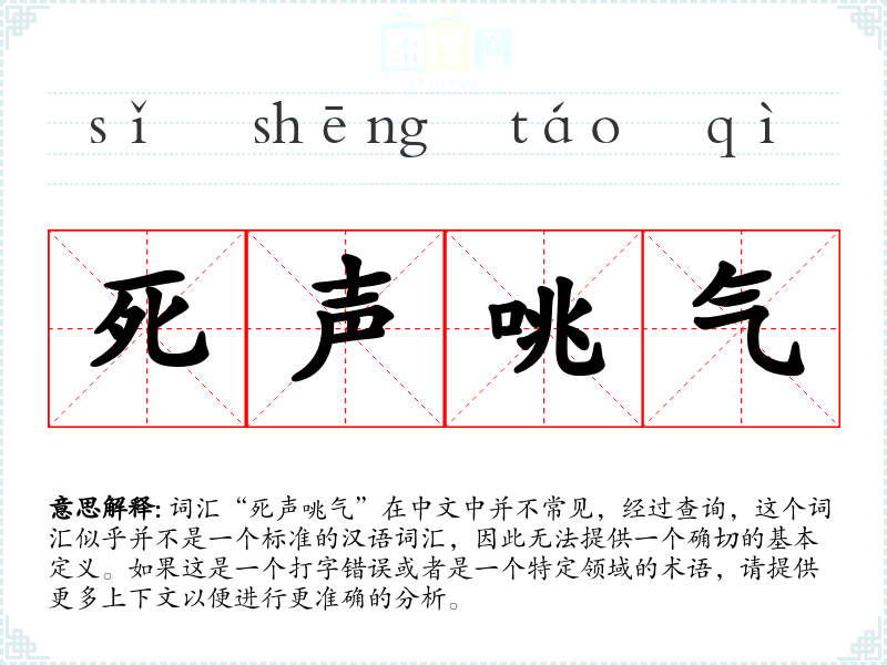 由于“死声咷气”不是一个明确的词汇,本次分析基于假设性的理解进行。在实际的语言学习和表达中,遇到不明确的词汇时,应尽量查找可靠的来源进行确认,以避免误解和误用。