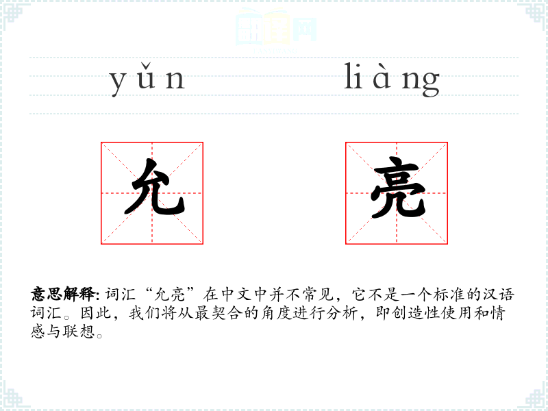 由于“允亮”不是一个标准词汇,个人应用可能需要创造性的解释。例如,在描述一个明亮和清晰的场景时,可以使用这个词来增加表达的独特性。