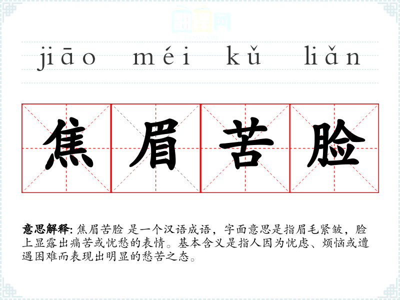 焦眉苦脸 是一个汉语成语,字面意思是指眉毛紧皱,脸上显露出痛苦或忧愁的表情。基本含义是指人因为忧虑、烦恼或遭遇困难而表现出明显的愁苦之态。