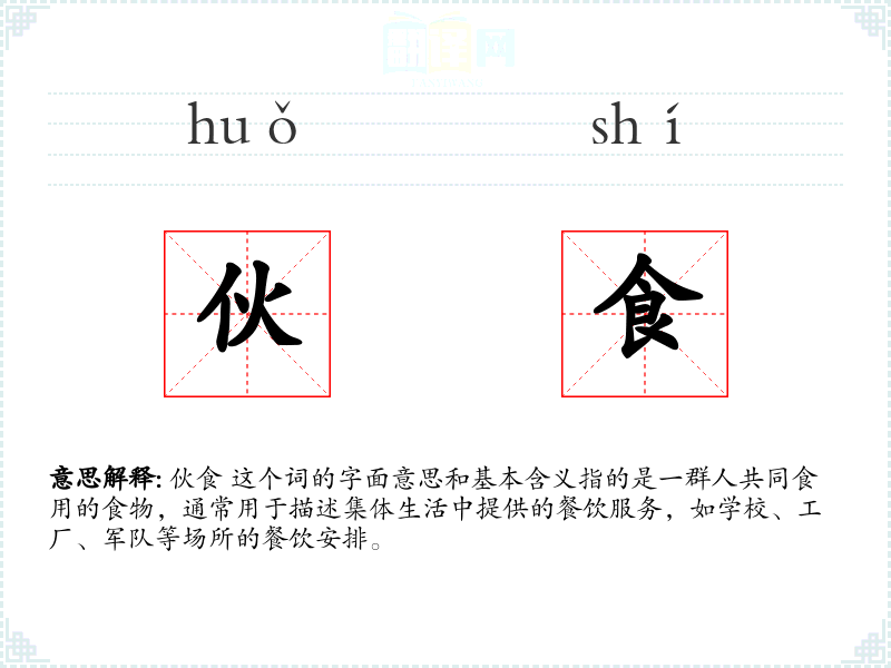 伙食 这个词的字面意思和基本含义指的是一群人共同食用的食物,通常用于描述集体生活中提供的餐饮服务,如学校、工厂、军队等场所的餐饮安排。