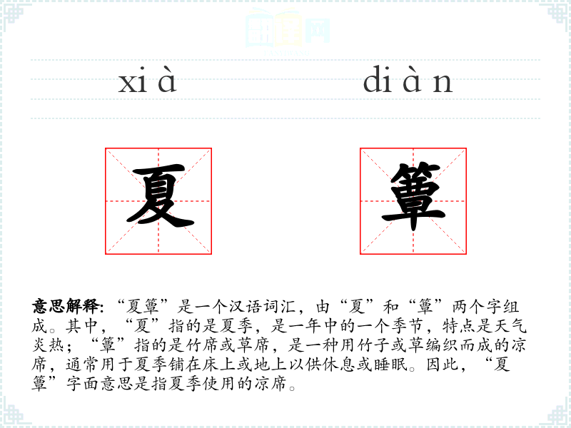 “夏簟”是一个汉语词汇,由“夏”和“簟”两个字组成。其中,“夏”指的是夏季,是一年中的一个季节,特点是天气炎热;“簟”指的是竹席或草席,是一种用竹子或草编织而成的凉席,通常用于夏季铺在床上或地上以供休息或睡眠。因此,“夏簟”字面意思是指夏季使用的凉席。