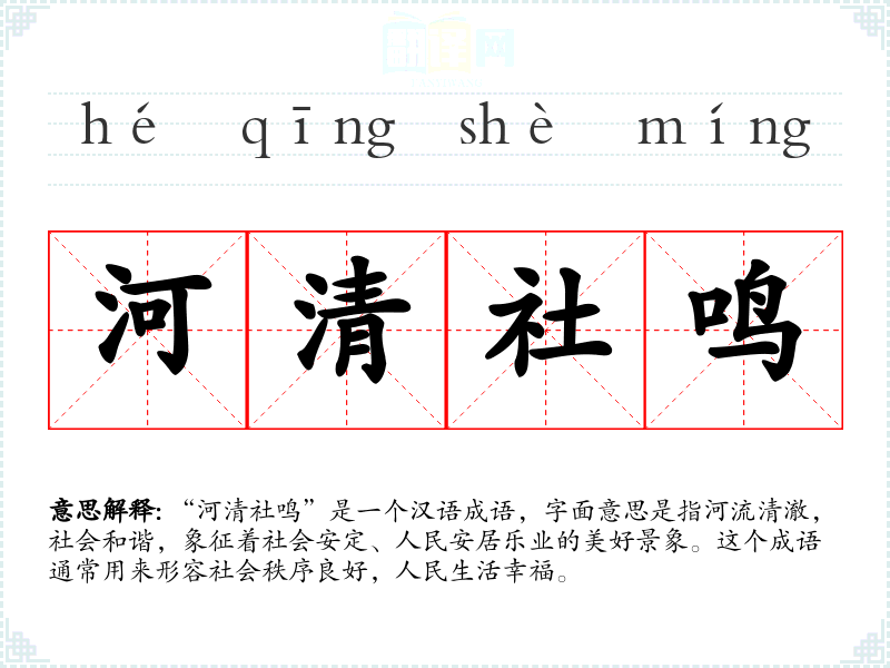 “河清社鸣”是一个汉语成语,字面意思是指河流清澈,社会和谐,象征着社会安定、人民安居乐业的美好景象。这个成语通常用来形容社会秩序良好,人民生活幸福。