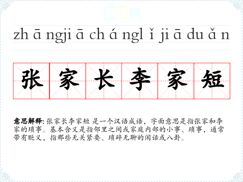 张家长李家短 是一个汉语成语,字面意思是指张家和李家的琐事。基本含义是指邻里之间或家庭内部的小事、琐事,通常带有贬义,指那些无关紧要、琐碎无聊的闲话或八卦。