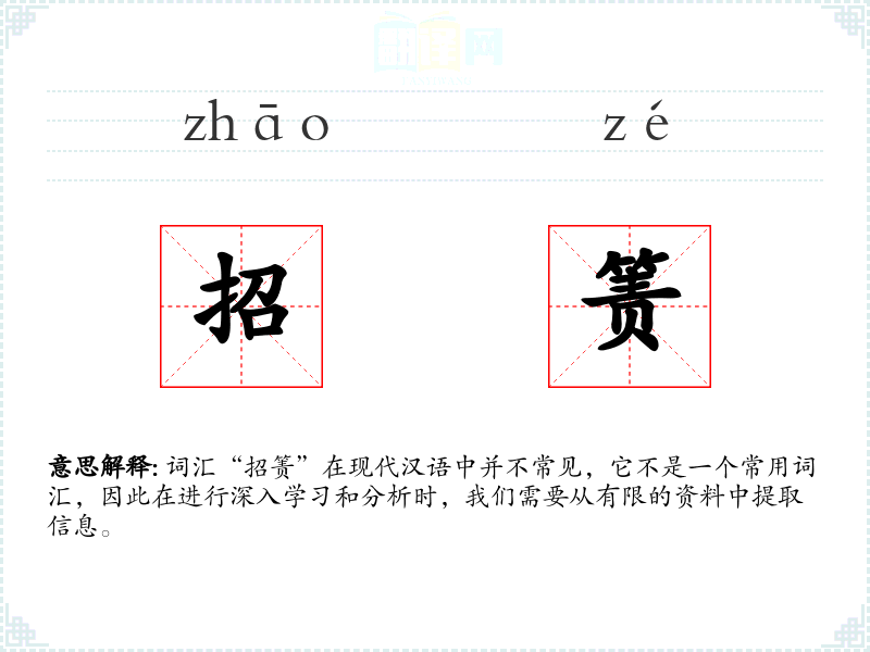 词汇“招箦”在现代汉语中并不常见,它不是一个常用词汇,因此在进行深入学习和分析时,我们需要从有限的资料中提取信息。