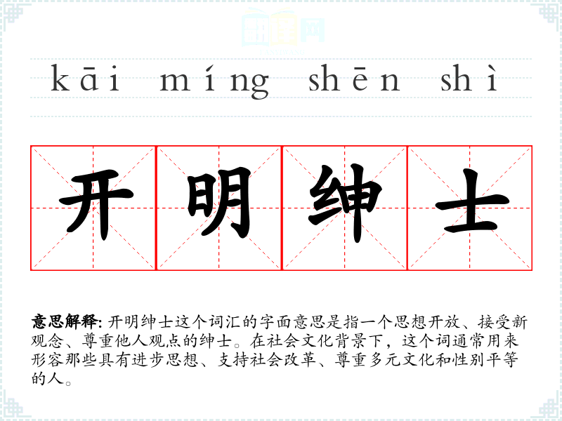 “开明”一词源自汉语,意指思想开放、不拘泥于传统。“绅士”则源自英语“gentleman”,原指有社会地位的男性,后逐渐演变为指有教养、有礼貌的男性。两者结合,形成了“开明绅士”这一词汇,强调了在社会地位和教养基础上的思想开放性。