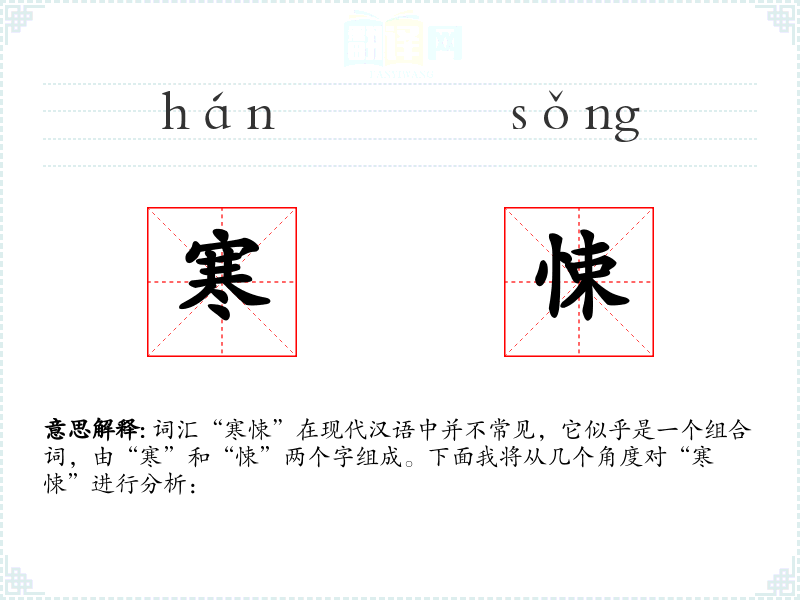 - 字面意思:结合“寒”(寒冷、冷淡)和“悚”(恐惧、害怕)的意思,可以理解为因寒冷或恐惧而感到的不适或惊恐。