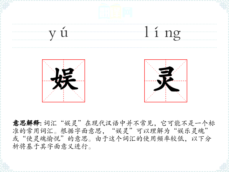 词汇“娱灵”在现代汉语中并不常见,它可能不是一个标准的常用词汇。根据字面意思,“娱灵”可以理解为“娱乐灵魂”或“使灵魂愉悦”的意思。由于这个词汇的使用频率较低,以下分析将基于其字面意义进行。